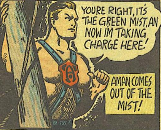 Amazing Man. John Aman is Amazing Man. “25 years ago, in the dismal country of Tibet, the Council of Seven chose an orphan of superb physical structure, and each did his part to develop in this child all the characteristics of a man who would dominate the world of men by his strength, knowledge and courage...six of the council have endowed him with the benefits of kindness and tolerance and bravery, but a seventh, ‘The Great Question,’ covets plans of dire evil for the perfect boy....” Despite the Great Question’s attempts at telepathic control over Aman, he goes to the outside world and fights crime. Amazing Man's powers include super-strength, invulnerability, speed, healing, telekinesis, limited shape-changing, and the ability to "make himself disappear in a cloud of green vapor." It is for that last power that he is also known as "the Green Mist." His kid sidekick is Tommy, the Amazing Kid. Amazing Man is also helped by Zona Henderson, “ace girl crime investigator." Amazing Man fights ordinary murderers and blackmailers, German pilots in the skies above France, and foreign saboteurs, but his arch-enemy is the Great Question, who Aman fights on a number of occasions. Amazing Man appears in stories with titles like “Mr. Que’s Magnified Ray” and “Death Looks in a Mirror.”