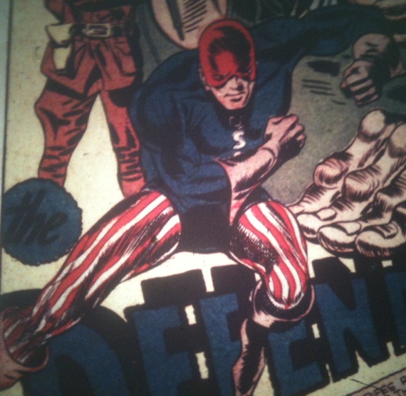 Defender (II). “Out of the wars and strifes rampant throughout the civilized world; out of the crimes and horror which follow in their deadly wake-a new champion joins the fight for the sacred cause of democracy! Strong, fearless and just–the Defender stands as a warning that so long as there is injustice and evil–so long will there be a Defender to battle them!” Don Stevens, Marine, changes into the Defender when a threat to liberty presents itself, and with his boy sidekick Rusty (II) fights the enemies of the United States. He has no powers. His Lois Lane is Sally Kean, who always gets in trouble trying to prove herself to the Defender. Among the enemies they fight is “the hideous Dame Kackle, deadliest agent of the dreaded Nazi Gestapo!”