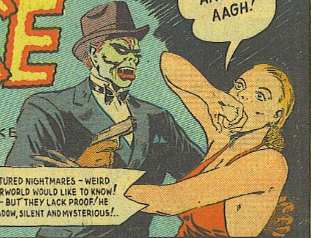 Face. Tony Trent, a radio announcer, is disgusted by the constant news of crime that he has to announce. So he decides to fight it himself. He hires a man to make a horrifying face mask for him, and uses it to terrify criminals--their fear gives him a momentary advantage over them. The mask can be folded up and tucked into a vest pocket. He has no superpowers, but he has and uses guns when necessary. He is assisted by his secretary Babs, who knows about Trent’s other identity. The Face fights ordinary criminals, gold-makers, The Hook, and even the Japanese when the Face frees the Flying Tigers from a Japanese ship. In 1945, after the war ends, Trent becomes a hard-boiled private detective, with the Face appearing only rarely. The Face appears in stories with titles like "The Murder of Sir Bertram," "The Millionaire Killer," and “The Face, Master of Evil.”
