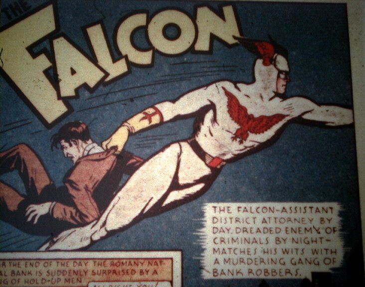 Falcon (II). “Meet the Falcon, nemesis of the underworld Criminals tremble at the mention of his name, for escape they may the long arm of the law, there’s no escaping the clutching talons of the Falcon!” By day the Falcon (II) is Carl Burgess, a "brilliant young assistant District Attorney." When he finds a criminal the law can’t stop, he goes after them as the Falcon. He has no powers, although he seems to glide around a bit more than normal, but he's good with his fists.