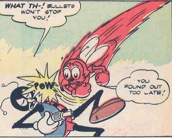 Freddy the Firefly. Firefly, “the flaming meteor of justice,” is actually little Freddy Fly, whose grandfather was a hero once and longs to be again. But when crime threatens, it is Freddy, “meek little Freddy” who says the magic words “Flame on!” and “becomes the hottest thing on the wing—mighty Firefly himself!” He has the Superman suite of powers.