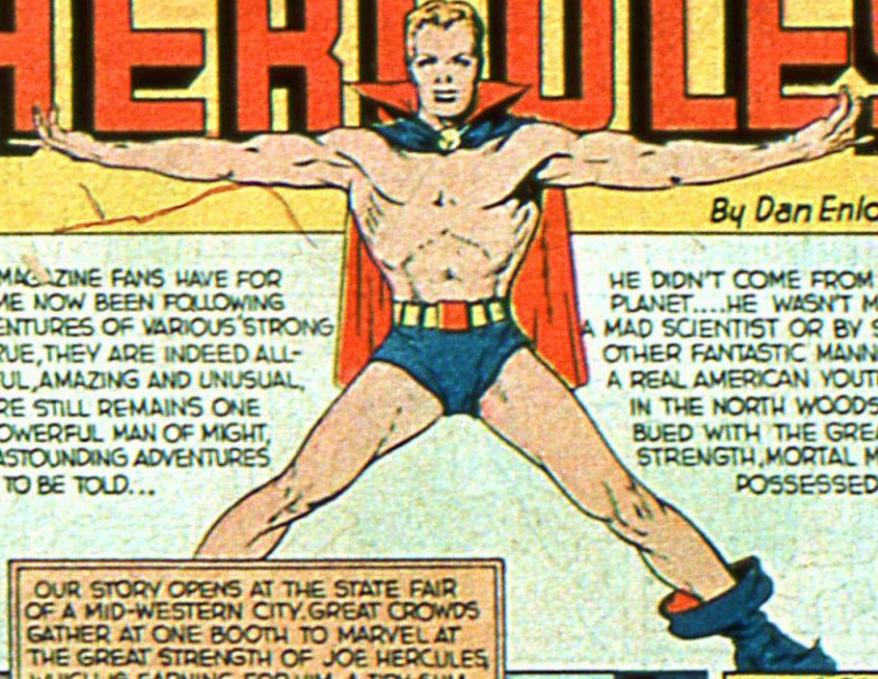 Hercules (III). Joe Hercules is born in "the North Woods" as the "strongest man in history." While he is working as a strong man in a circus in the Midwest a gang of criminals fake a foreclosure on his widowed mother's house. Joe's mom dies from a heart attack, and Joe swears revenge. He goes to New York and beats up the bad guys, ending up in jail for his trouble. While in the clink he is told about Doll Man and is inspired to break out of jail, put on a costume, and fight crime. He clears his name and then goes on to fight crime. Joe has super-strength and is capable of punching his way through stone walls. In one story he teams up with Uncle Sam, Neon the Unknown, Quicksilver, the Ray, and Black Condor. He appears in stories with titles like “The Texas Oil Field Mystery,” “The Power-Stealing Tower,” and “The Villains’ Revolt.”