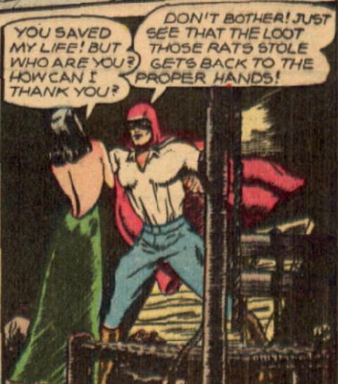 Phantom Falcon (III). “Chet Horne - by day an inconspicuous file clerk. By night - the daring Phantom Falcon, scourge of the underworld!” Horne works in the police commissioner’s office as a way to get tips and information on threats to civilians and the city. (Other policemen think of him as a “runny-nosed punk” who “didn’t have what it takes to be a cop”). The Falcon flies a special jet. He fights ordinary criminals, racketeers, air pirates, Soviet spies, and the hatchet-wielding femme fatale Frisco Sal.