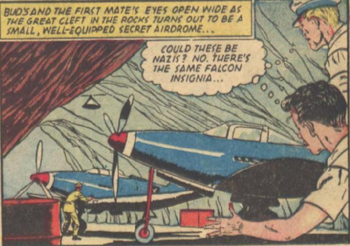 Phantom Falcons (II). “The Phantom Falcons–a gallant gang of misfit flyers–Jock Sturtevant, rich New York Sportsman, Ace Ely, holder of many air records, who has been turned down by the U.S. Air Force, and Peg Darnell, a girl who wants a man’s brand of glory.” They are joined by “John Lovelace, gallant sailor and airman,” and teenaged sailor Bud. Together they fly a group of Airacobras against the Japanese, operating out of a secret island base. Each plane has a falcon insignia on it, and Sturtevant, the leader of the group (he’s legless), owns pet hunting falcons. The Phantom Falcons (II) appear in stories with titles like “The Seizure of Island X.”