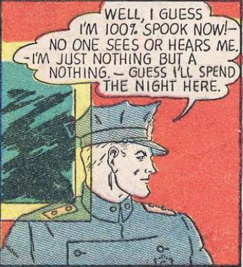 Sergeant Spook. Sergeant Spook is an ordinary police scientist who is working on a chemical analysis when he "absent mindedly leans his pipe against a rack containing vials of chemicals." This sets off an explosion which kills him. However Sergeant Spook's ghost remains, and he decides to fight crime as a ghost. He can't be heard or seen but he can physically affect people and things as well as walk through walls. He begins by fighting ordinary crimes, but then he discovers that there is a Ghost Town in his city, full of all the world’s ghosts, from Nero to Ali Baba and his Forty Thieves, and that they aren’t allowed (under ordinary circumstances) to leave Ghost Town. However, like Doctor Sherlock (a Sherlock Holmes clone who becomes Spook’s sidekick), Sgt. Spook receives permission to leave Ghost Town to track down criminal or errant ghosts. This brings him into conflict with a wide array of enemies, like King Tut, who has enslaved the ghosts of North Africa, and Doctor Zorka, a Mad Scientist creating zombies to use as slaves. Sergeant Spook appears in stories with titles like “The Case of the One Eyed Cyclops,” “The Lion That Was Framed For Murder,” and “Ghost-Town Ghosts.”