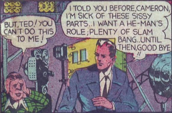 Parrish, Ted. “Ted Parrish, young movie idol, bored with the tinsel and lights of Hollywood, fumes at the love story roles he has been assigned and walks out of the studio.” He finds a crime instead, and solves it, using his fists and his nearly miraculous skill at disguise. He becomes Ted Parrish, the Man with 1000 Faces, a crime-fighter who fights hijackers, foreign subversives, and master criminals like The Boss. In Speed Comics #23 he is part of a one-time super-team with Shock Gibson, Pat Parker, Girl Commandos, Captain Freedom, Dick Lane, and the Black Cat. Ted Parrish appears in stories with titles like “The Curse of Cave Canyon,” “The Beast Strikes,” and “Substitute for the Secretary of State.”