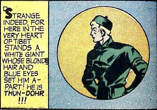 Thun Dohr. “In the farthest depths of unknown Tibet--league upon league beyond unclimbable mountains and timeless glaciers—lies the mystic monastery of Lha I Ha! Here in quiet courts where the power and knowledge of ages sleep secure—Thun Dohr, American born lama, makes ready for a mighty task!” This Westerner serves “an ancient Dalai Lama who sits as he has sat for 300 years on a throne of solid gold.” Left in Tibet when his parents’ expedition died in the snows, Thun Dohr was raised in the lamasery and has “achieved what the world’s finest minds claimed impossible--complete mastery of mind over matter!!” This mastery includes invisibility, immunity to fire and ice, and the ability to survive in a vacuum. He uses these abilities to fight wickedness, including an obese misanthropic Yellow Peril who deliberately opens Pandora’s Box. Thun Dohr appears in “Origin of Thun Dohr” and “The Great American Pyramid.”