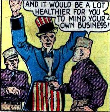 Uncle Sam. Ezra Smith, a patriotic American, tries to oppose a group of fascists calling themselves the “Purple Shirts.” For his troubles he gets shot dead. His son Buddy, heart broken, runs away into the nearby desert. Moments later he hears “Yankee Doodle” being whistled, and then meets Uncle Sam, the embodiment of American patriotism. Uncle Sam goes on to kick butt and take names for the American way. He is assisted by Buddy (II). He has super-strength, can perform Hulk leaps, can’t be photographed, and has limited precognition. In one story he teams up with Hercules (III), Neon the Unknown, Quicksilver, the Ray, and Black Condor. He fights a variety of Axis agents, human and super-human, from the Black Legion to the shrink-ray-wielding Professor Nakajima. Uncle Sam also fights the Mad Scientist Dr. Dirge, the King Killer, and the insanity-causing Mad Poet. Uncle Sam appears in stories with titles like “Yiffendi Invades the Philippines,” “Spy With Two Faces,” and “The Great Darkness.”