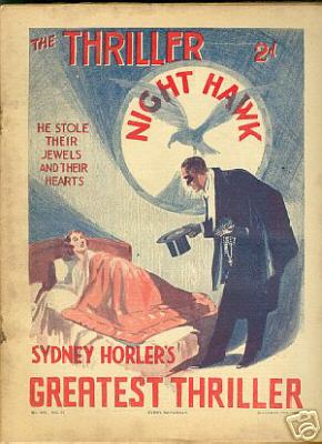 Nighthawk. The Nighthawk was created by Sydney Horler (Brett Carstairs, Bunny Chipstead, H. Emp, Brian Fordinghame, Rex Hartley, Martin Huish, Gerald Lissendale, Justin March, George Meatyard, Sebastian Quin, Tiger Standish, Baron Veseloffsky, Dr. Paul Vivanti) and appeared in a number of stories and seven novels and short story collections from 1936 to 1954, beginning with “Night Hawk” (Thriller, Oct. 24, 1936).