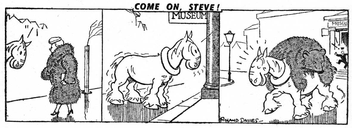 * I'm including "Come on Steve" in the Best of the Encyclopedia list because the strip was well-written, deceptively well-drawn, and utterly charming. "Come on Steve" was popular in its heyday but has slipped into a memory hole and been dismissed by critics as a "gag strip." It was a gag strip, to be sure, but Davies made the gags work for eighteen years while also establishing the characters of Steve and his supporting cast--which is no mean feat. Cranking out funny joke strips week after week for years on end is hard--comedy is surprisingly difficult to do on a consistent basis. Steve himself is charmingly good-natured, but what really stands out is the humor Roland Davies creates and maintains in the strip. It's a technical achievement deserving of respect.