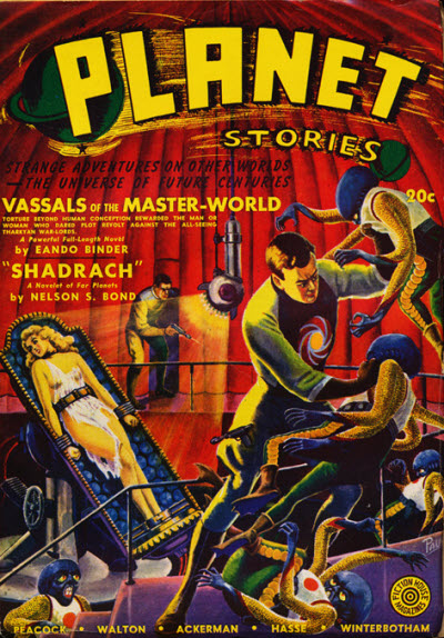 Chip Warren is a hard-bitten, hard-drinking spacer in Xuerl’s Cosmobar on Mars, “a place where a hard-fisted, full-pursed spaceman, newly in from the mines or out from Earth, could get a weapon or a wench, a bottle or a battle, any or all with equal celerity.” Warren notices that a miner, newly rich with a big strike of ekalastron (only the most valuable metal in the universe), is about to be drugged by a local crime boss, so Warren interferes. Warren is only saved from being shot by the intervention of “Salvation” Smith, “sin-driving missionary of the Wastelands,” someone more than a little similar to Solomon Kane. Warren, Smith, and Warren’s partner Syd Palmer travel through system, using the “velocity intensifier, invented by that mad genius of the spaceways, Lancelot Biggs,” and find adventure and fight evil.